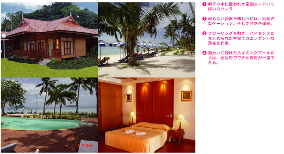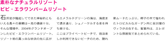 2005年6月、レムトン・ビーチにオープンしたピピ島・随一の豪華リゾート。全室スイート仕様のタイ様式の豪華ヴィラは、わずか47室。天涯付ベッド、リビングに置かれた椅子などアジアン・ヴィラの雰囲気いっぱいの客室。夕方になるとホテル前のビーチに、ゴザの上にデイベッドが置かれたバーがオープン。お酒と満点の星空が楽しめる。 |