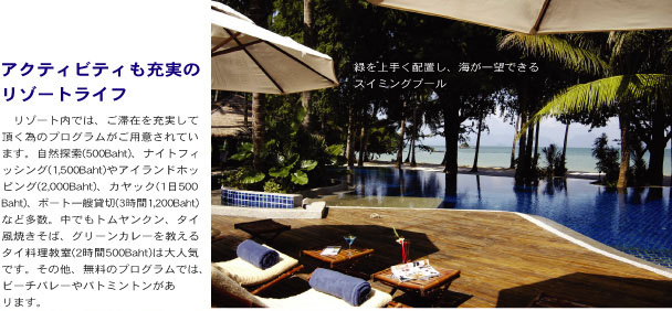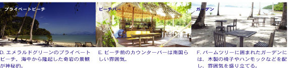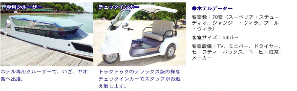 プーケット空港を降り立ち、車で移動すること7〜8分、リゾート専用のクルーザーが停泊しているヨットハーバーへ到着。出発までホテル専用のラウンジで冷たい飲み物のサービスがあるます。ボートの運航スケジュール設定はなく、ゲストの到着時間、出発時間に合わせ運行されています。出港後、約50分程で未開の島・ヤオ島が見えてきます。桟橋からは、トゥクトゥクのデラックス版?とも言えるチェックインカーで、ロビーへ。ワンアイランド・ワンリゾートの様な、自然と調和したリゾート宿泊者専用のプライベートビーチが一面に広がります。ビーチ前には沢山の椰子の木がそびえ立ち、南国の雰囲気を醸し出しています。また、石灰岩が海中から隆起してできた奇岩が、リゾート全体を覆っているかの様な不思議な空間も目の当たりにできます。客室は計70室で、スーペリア・ステューディオ、ジャグジーヴィラ、プールヴィラの3タイプより選択頂けます。宿泊ゲストのリクエストに快く対応してくれるスタッフがお待ちしております。例えば、家族4名1室で宿泊したいとの要望には、ダブルベッド1台、シングルベッド1台、ソファーベッド1台の客室へ通すなどのアレンジを快くしてくれるのも嬉しい。 |