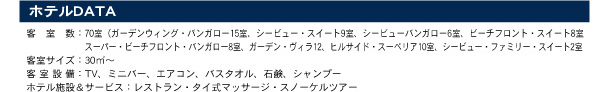 パクメン港からホテル専用ボートで20分程走させると見えてくる、小さな孤島が『ガイ島』。島まるごとがリゾートになっていて、約5km程続く白い砂浜、目の前に広がる美しい海とカラフルな素晴らしい珊瑚礁。まさにガイ島は自然の宝庫、そして楽園リゾートといえる。リゾート前のビーチへ横付されたボートを降り、手作り・木製のファンタシーリゾートのエント ランスをくぐると、自然と調合した可愛らしいわらぶき屋根の全独立型のシービュー・バンガローが点在する。客室内からは、海が眺望でき、白を基調に上手にまとめられていて、居心地良い。以前レストランのみだった施設が、2005年にはラグジュアリータイプの客室の増設やスパがオープンして、ますます利用しやすくなった。騒音を逃れた大人のリゾートとしての魅力は見逃せない。