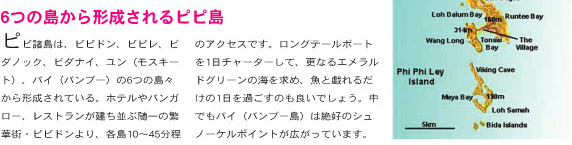 クラビーの南約42km、プーケットの南西約48kmにある、アンダマン海に浮かぶ大小2つの島。大きい方が観光地として有名なピピ・ドン島。その南にある小さい無人島が、映画「ザ・ビーチ」のロケ地として有名なピピ・レ島。島の周囲には美しいシュノーケリングポイントが点在しています。